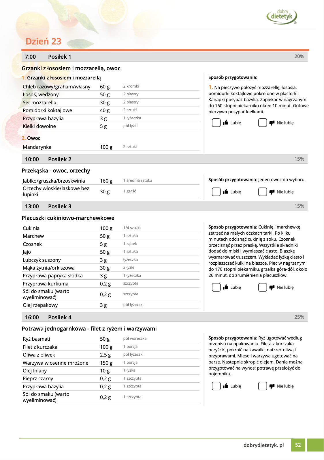 • w formie propozycji posiłków (zamiast pojedynczych jadłospisów jednodniowych, przygotowano propozycje kilku propozycji dań na każdy posiłek). Tutaj nie uzależniamy Cię od tego jakie masz np. w danym dniu zjeść śniadanie czy obiad, tylko sam wybierasz sobie ulubione danie z kilku przedstawionych przez nas propozycji.