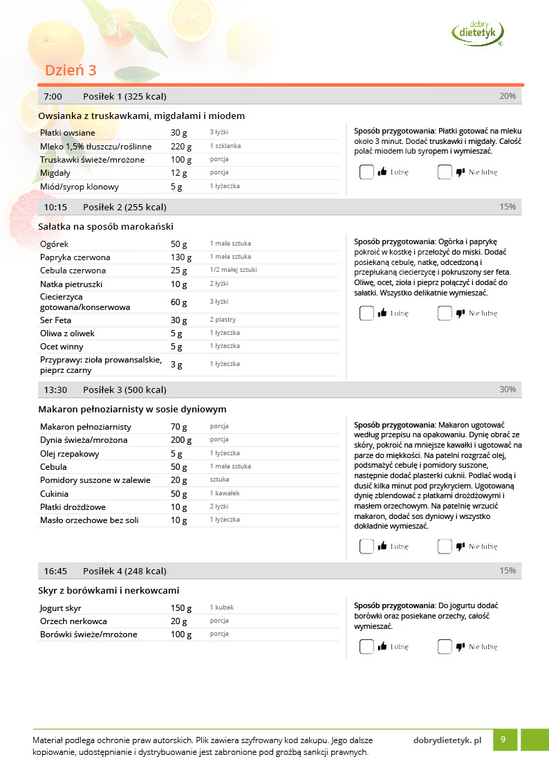 • w formie precyzyjnych jadłospisów wielodniowych (na każdy dzień miesiąca jest opracowany osobny jadłospis). Tutaj nie musisz zastanawiać się co zjeść każdego dnia, gdyż będziesz mieć dokładnie wszystko rozplanowane.
