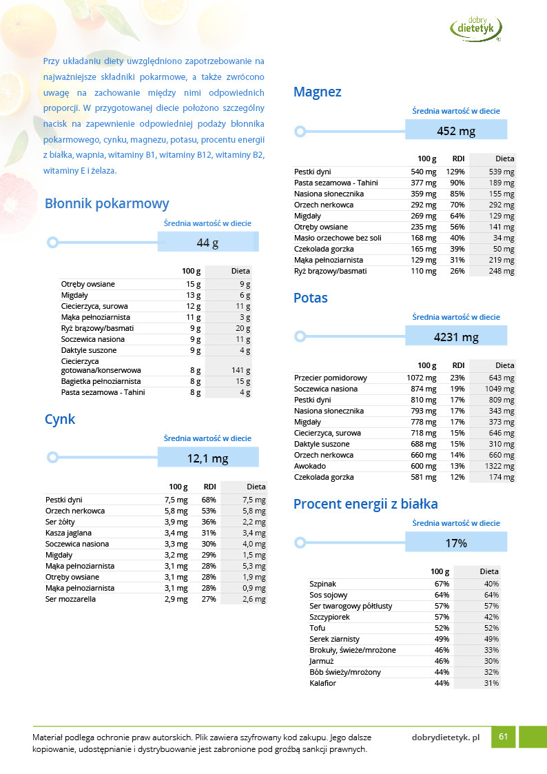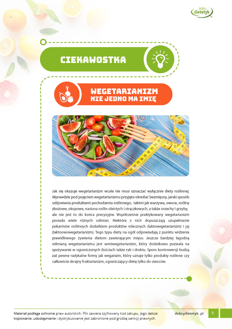 Kompleksowy, 30 dniowy program dietetyczny opracowany specjalnie dla KOBIET praktykujących lub chcących praktykować WEGETARIANIZM. Jadłospis oparto o produkty pochodzenia roślinnego z niewielkim dodatkiem produktów mlecznych o dużej zawartości białka. Dieta została skomponowana przez zespół dietetyków specjalizujących się w tematyce diety wegetariańskiej. Ta bardzo urozmaicona, niezwykle pożywna i wyjątkowo smaczna dieta zadowoli każdego, kto szuka zdrowych i wartościowych dań wegetariańskich. Pod względem odżywczym w diecie położono w szczególności nacisk na podaż takich składników jak białko, żelazo, witaminy grupy B oraz wiele minerałów których często brakuje w dietach roślinnych. Dieta idealnie nadaje się dla osób, chcących też spróbować takiego modelu żywienia.