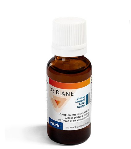 D3 Biane w kroplach to suplement diety na bazie oleju rzepakowego i witaminy D3. Suplement diety zapewnia 100% dziennego zapotrzebowania w witaminę D3, która przyczynia się do utrzymania właściwej struktury kostnej i prawidłowego funkcjonowania systemu odpornościowego.
